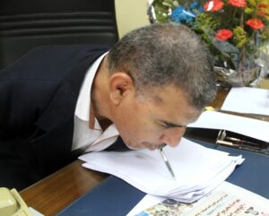 “عقيدتى” التقته بمكتبه بماسبيرو وسجَّلت بعدستها تلك اللحظات والتى منها قيامه بتسجيل كلمة شكر للجريدة بخط فمه الأكثر من رائع، ورصدت العديد من اللحظات التى تعد جزءا من معايشته فى يومه كرئيس لإذاعة القرآن، كل ذلك فى الحوار التالى.