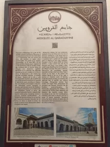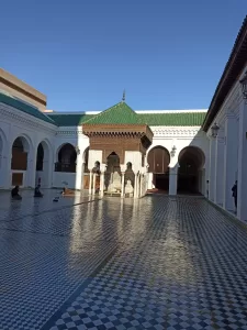 في بداية الجولة التقينا الشيخ عبدالمجيد المرضي، شيخ جامع القرويين، الذي قال: في مقدمة هذه المعالم جامع القرويين وقد بُنِيَ عام (245هـ=859م) على يد أُمِّ البنين فاطمة الفهرية القيروانية، التي يُقال إنَّها وهبت كلَّ ما ورثته لبناء الجامع، قبل أن يعمل أهل المدينة وحكَّام المغرب -على مدى التاريخ- على توسيع المسجد وترميمه والقيام بشئونه؛ حيث كان أهل المدينة وحكّامها يقومون بتوسعة المسجد وترميمه والقيام بشئونه، وأضاف الأمراء الزناتيون بمساعدة من أمويي الأندلس حوالي 3 آلاف متر مربع إلى المسجد، وقام بعدهم المرابطون بإجراء توسعة أخرى، وتُعدُّ صومعة المسجد المربَّعة الواسعة أقدم منارة مربَّعة في بلاد المغرب العربي، وهي لا تزال في المسجد قائمةً إلى الآن من يوم توسعة الأمراء الزناتيين عمَّال عبدالرحمن الناصر على المدينة.