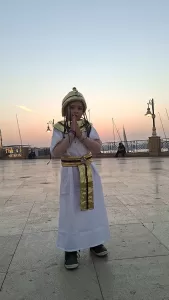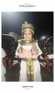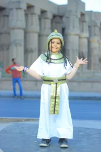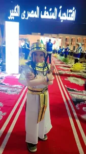 تلك كانت ابتسامة جويرية جمعة عبدالسلام، الطفلة الصغيرة التي خرجت من عباءة المرض لترتدي ثوب الأمل، زيًا فرعونيًا يعكس حضارة وطنها العريق، ووقفت بكل براءة وثقة وسط الجموع في ساحة أبو الحجاج، كأنها إحدى أميرات مصر القديمة عادت من صفحات التاريخ لتشهد الحدث العظيم.