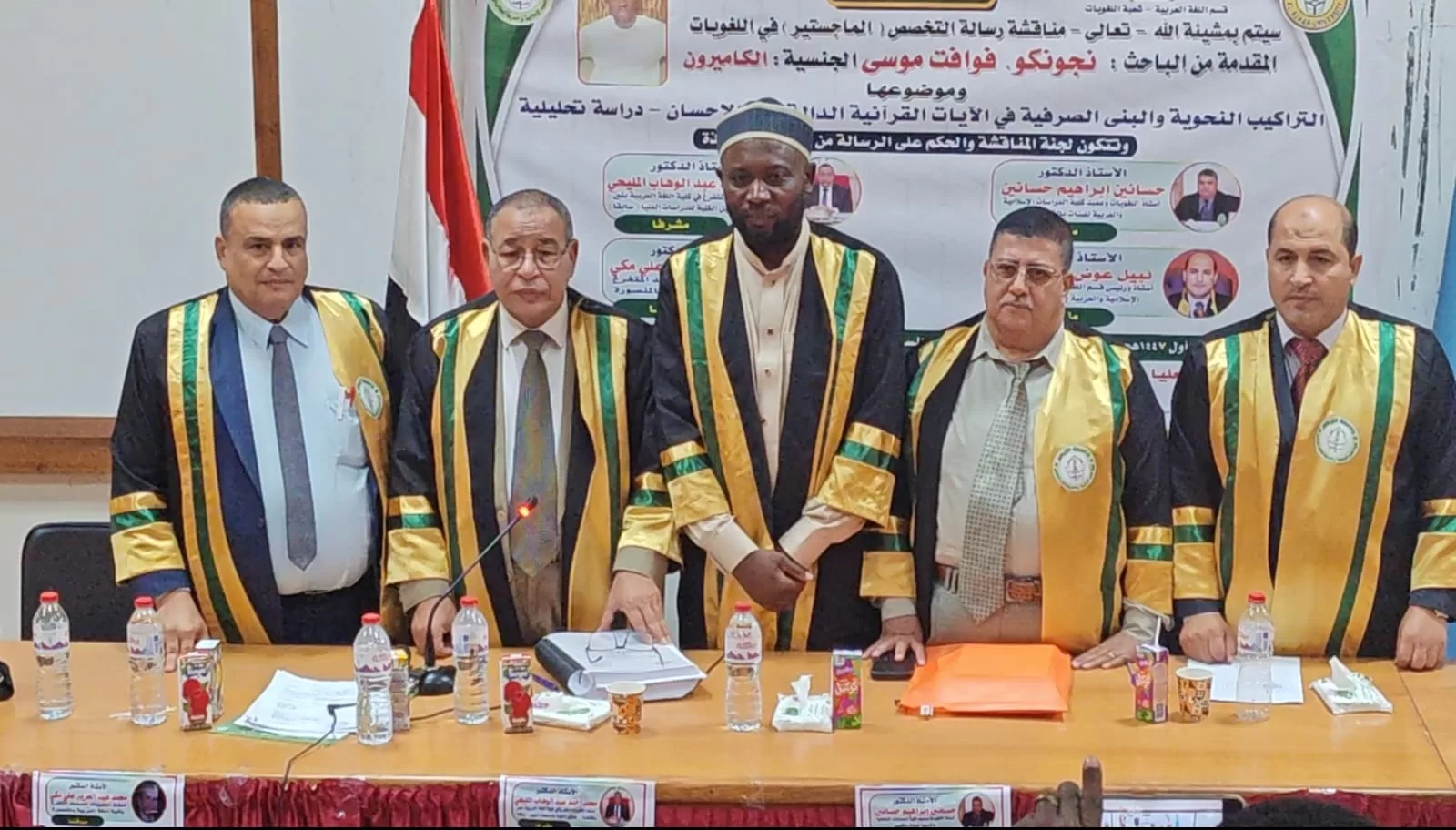 حصل الباحث نجونكو فوافت موسى كاميرونى الجنسية، على رسالة التخصص “الماجستير” في اللغويات من كلية العلوم الإسلامية والعربية للوافدين قسم اللغة العربية “شعبة اللغويات” بجامعة الازهر، وجاء موضوعها بعنوان: “التراكيب النحوية والبنى الصرفية في الآيات القرآنية الدالة على الإحسان – دراسة تحليلية.”