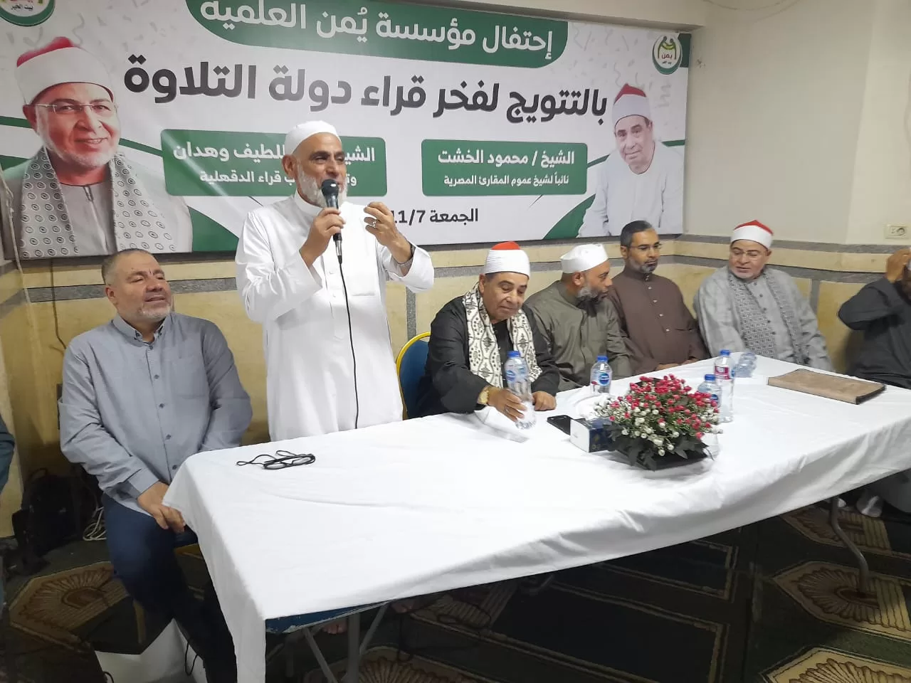 كرمت مؤسسة يُمن العلمية بالوراق جيزة، كلا من القارئ الإذاعى الشيخ محمود الخشت والمبتهل الإذاعى الشيخ عبداللطيف العزب وهدان، بمناسبة اختيار الشيخ الخشت نائبا لمشيخة عموم المقارئ المصرية ونائبا لنقيب محفظى وقراء القرآن، واختيار الشيخ وهدان نقيبا لقراء الدقهلية وتعيينه قارئا للسورة بمسجد السيدة سكينة رضى الله عنها.